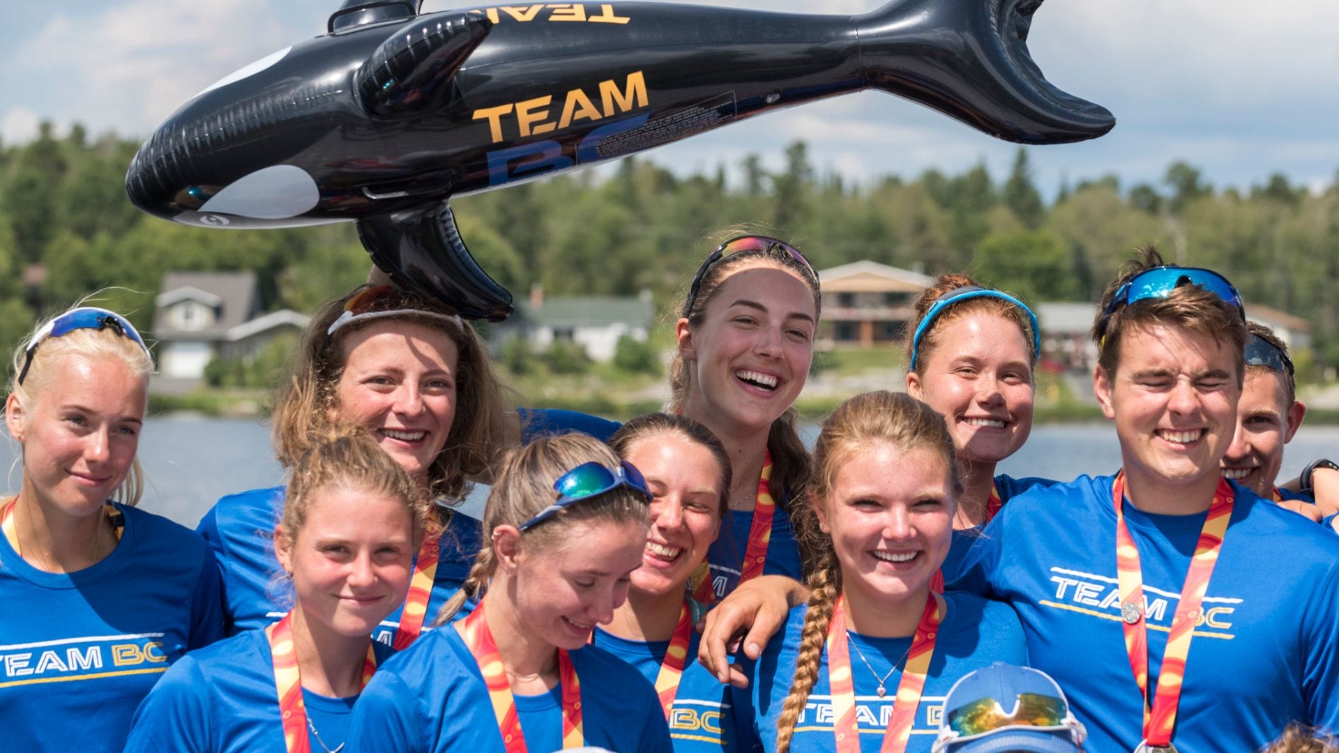 Avalon Wasteneys (centre, back) and teammates celebrate medals at the 2017 Canada Summer Games in Winnipeg.